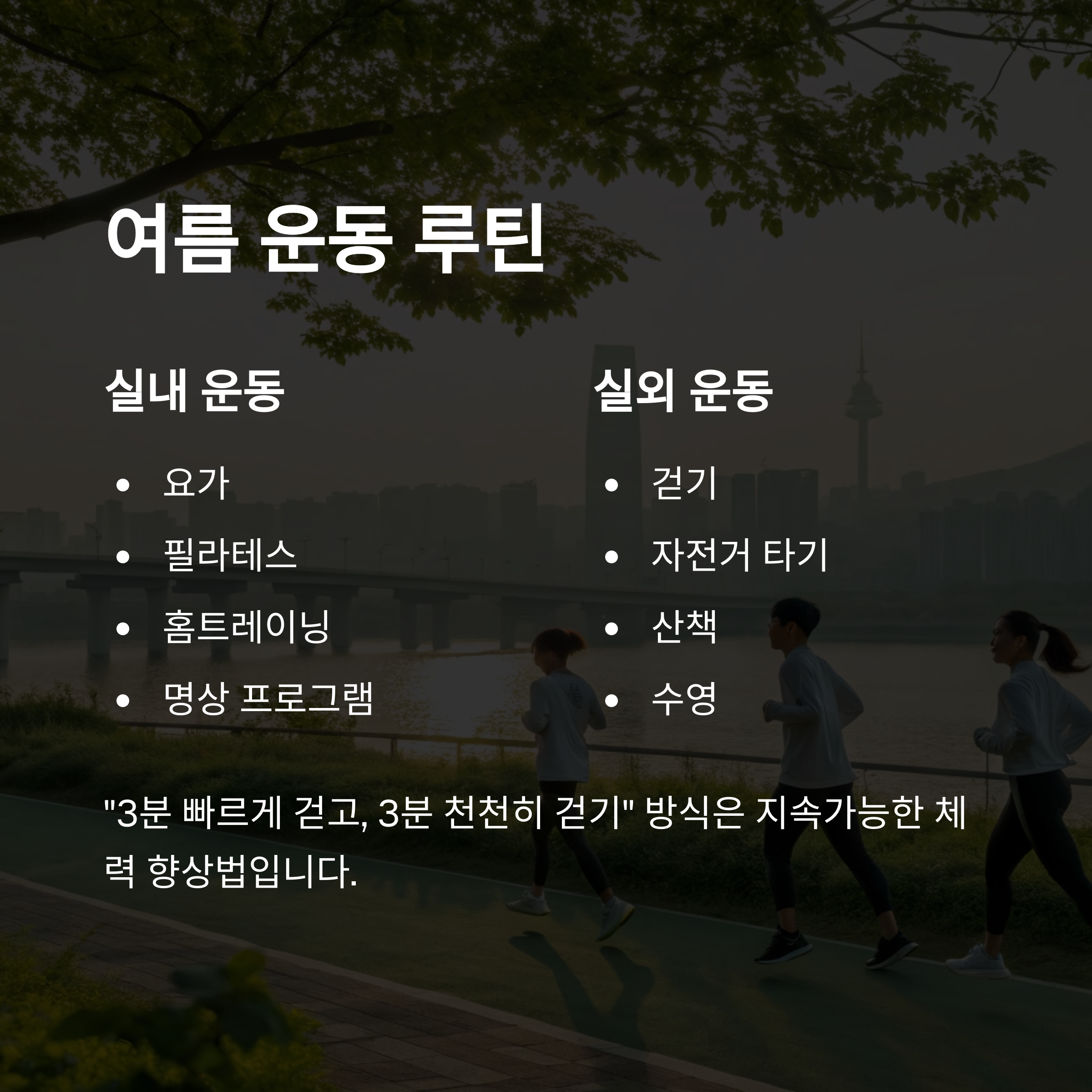여름철 운동은 강도보다 지속성과 장소 선택이 관건입니다.