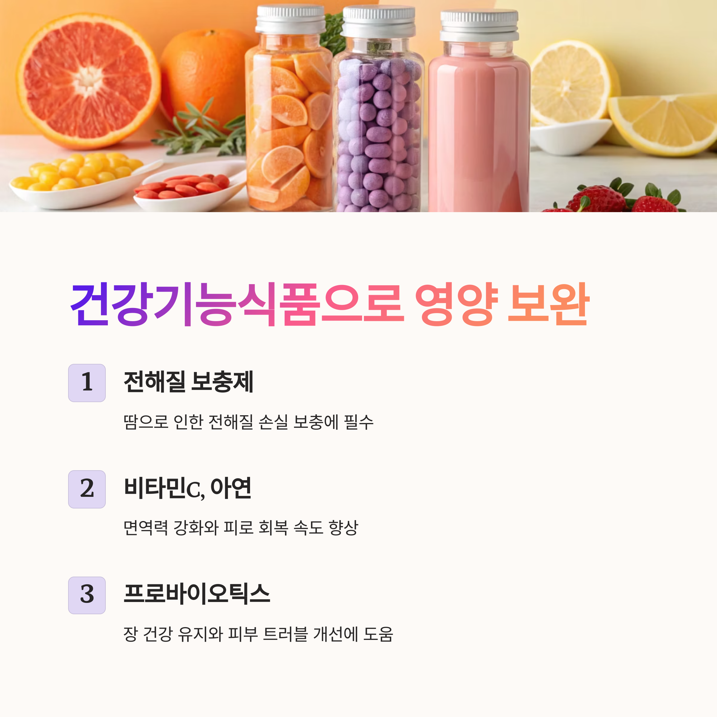 전해질 보충제와 함께 비타민C, 아연, 프로바이오틱스 등을 섭취하면