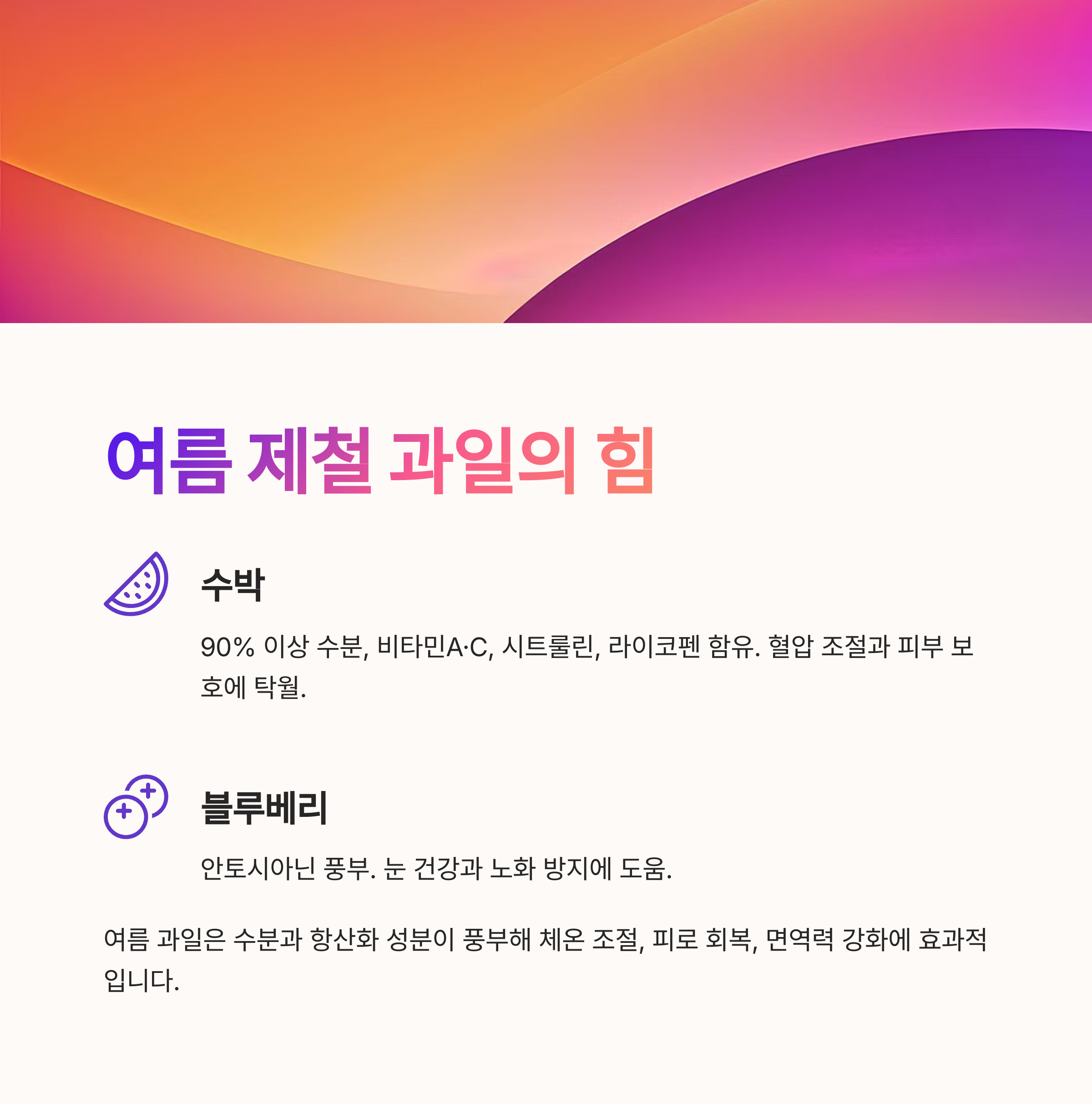 | 수박 | 수분, 비타민A·C, 칼륨, 라이코펜 등 | 탈수 방지, 피부 보호, 혈압 조절 | 30kcal |