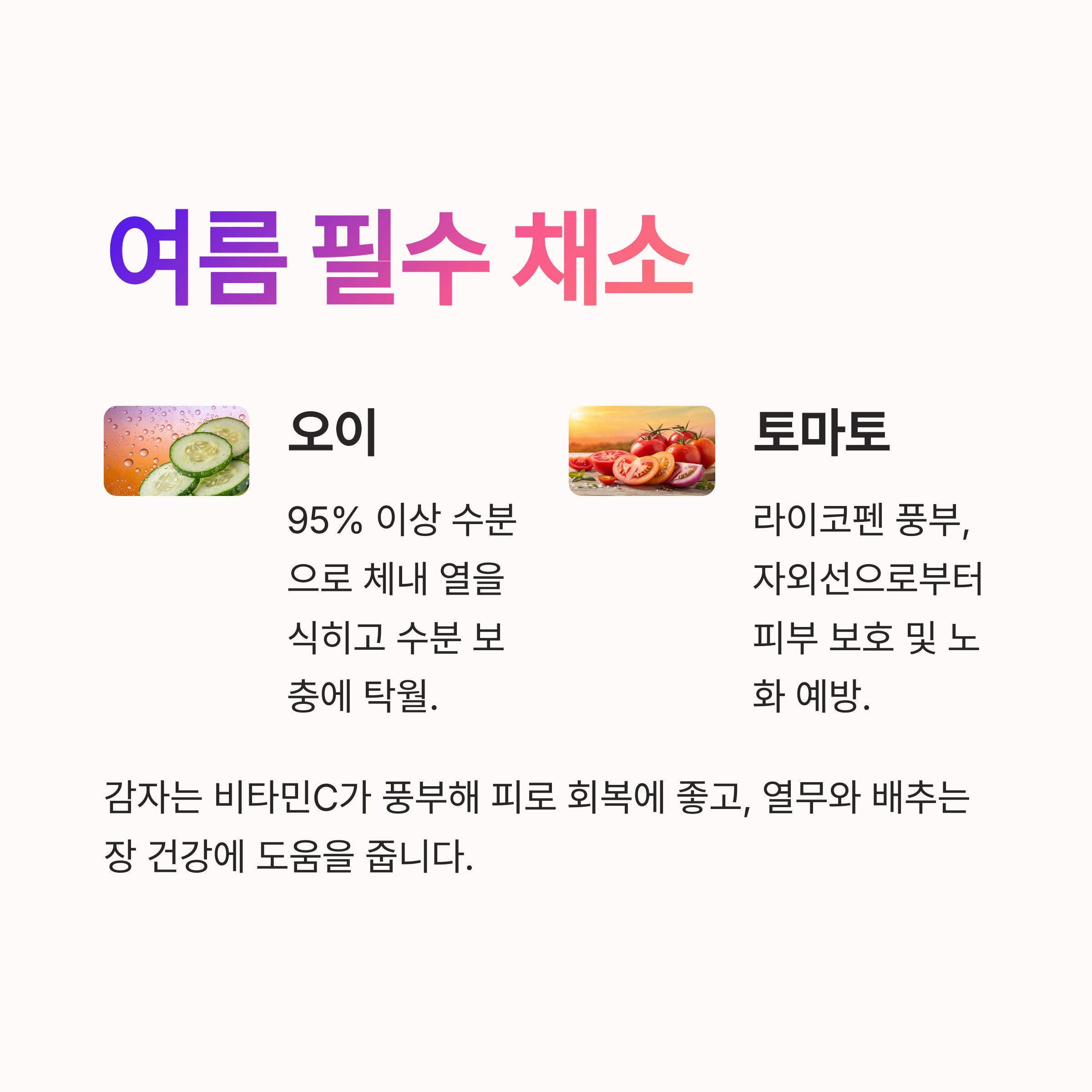 채소 중에서도 오이와 토마토는 여름철 꼭 챙겨야 할 식품입니다.