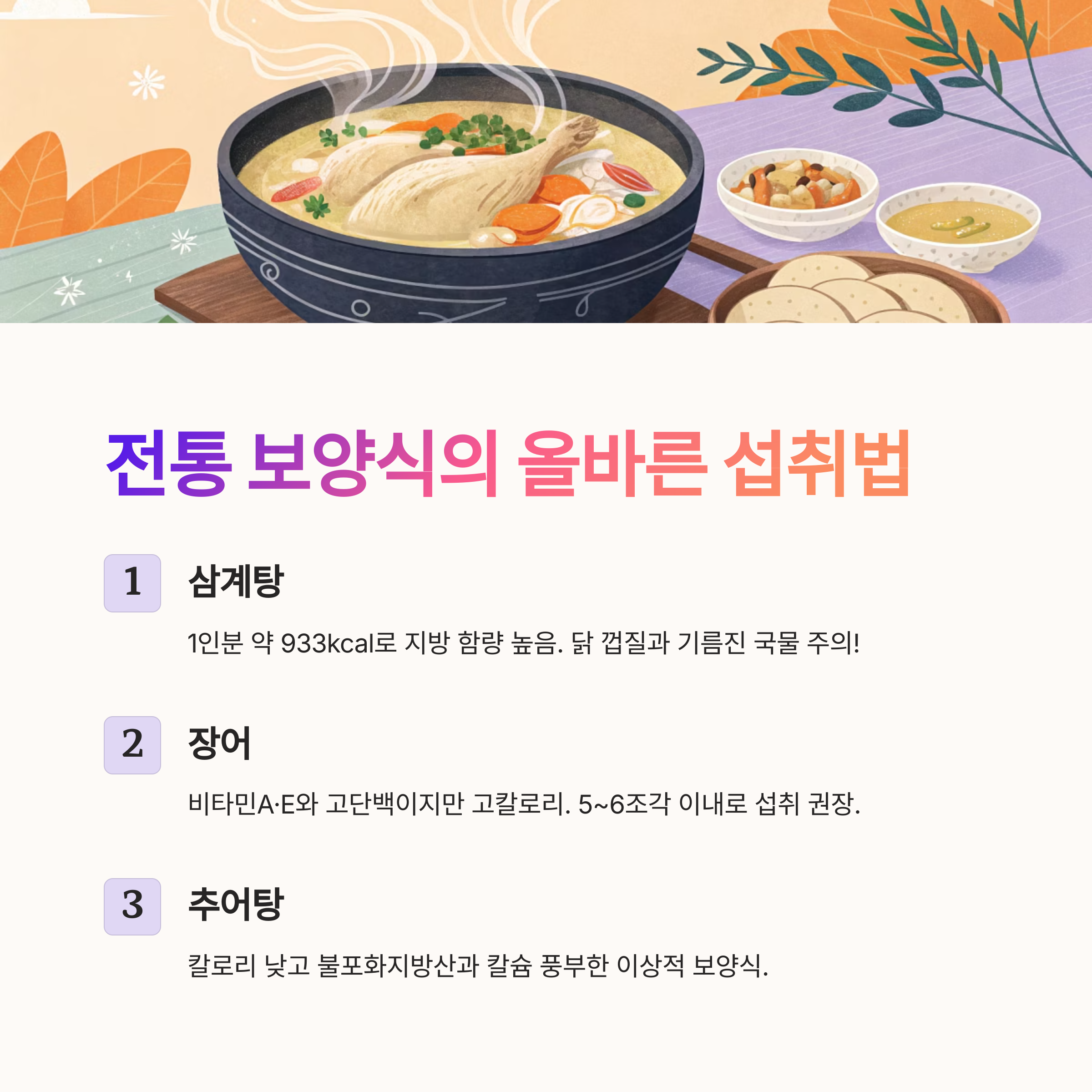 | 삼계탕 | 단백질, 지방, 미네랄, 비타민B군 | 체력 회복, 면역력 강화 | 933kcal |