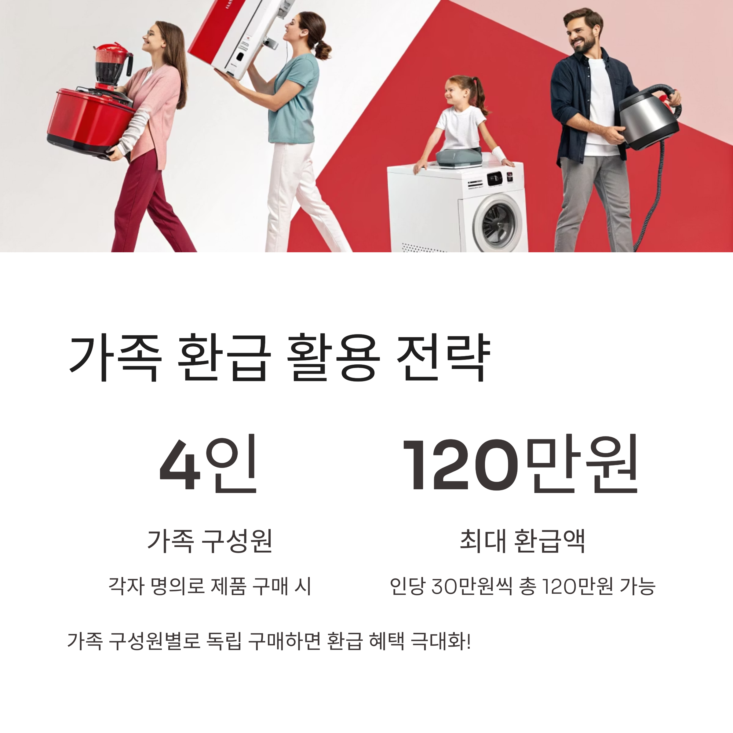 부부+자녀 2명 등 총 4인이 독립 구매 시, 총 120만원 환급도 가능합니다.
