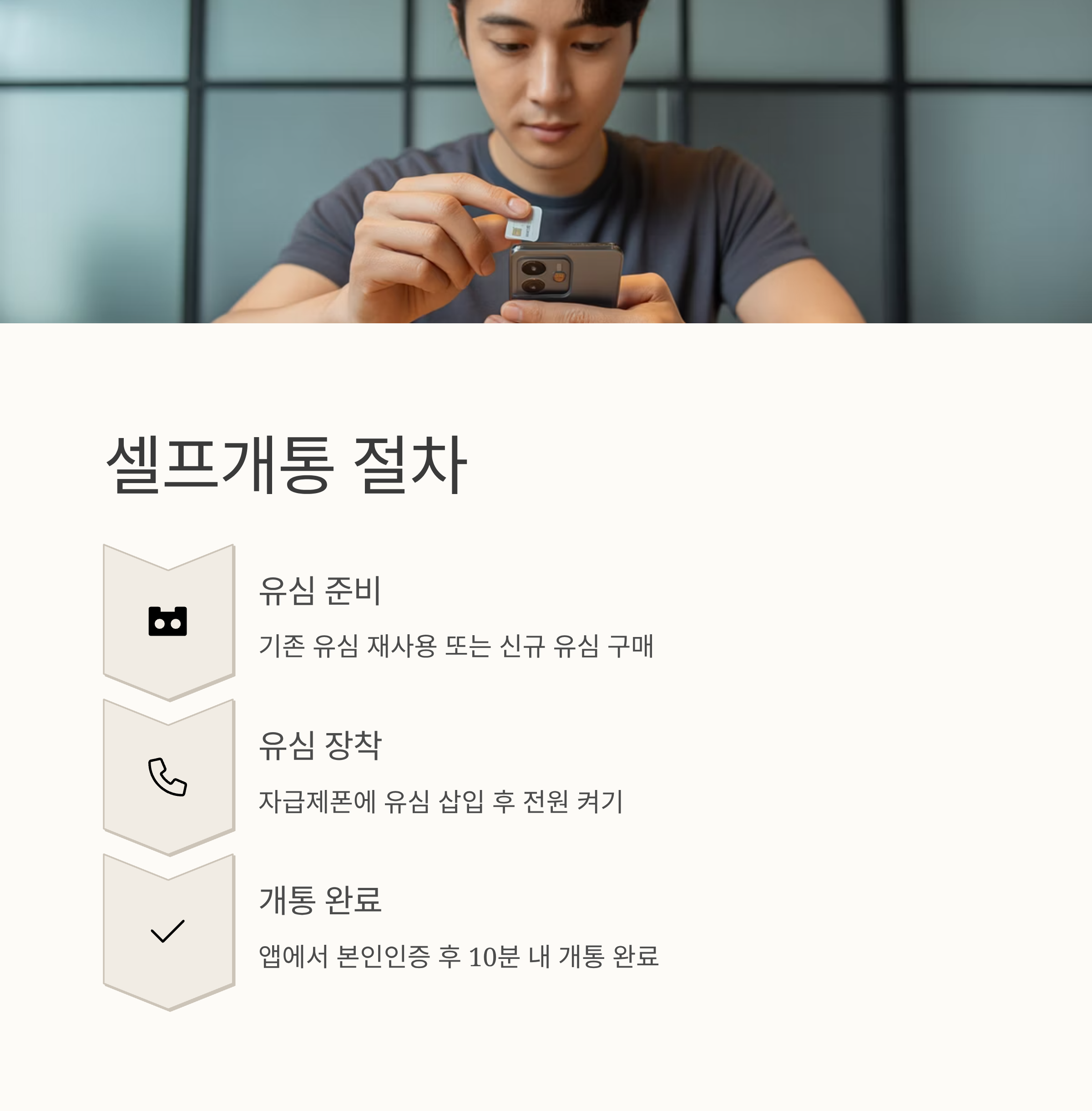 - 유심 수령 후 자급제폰에 장착하고, 앱에서 셀프개통을 시작하세요.