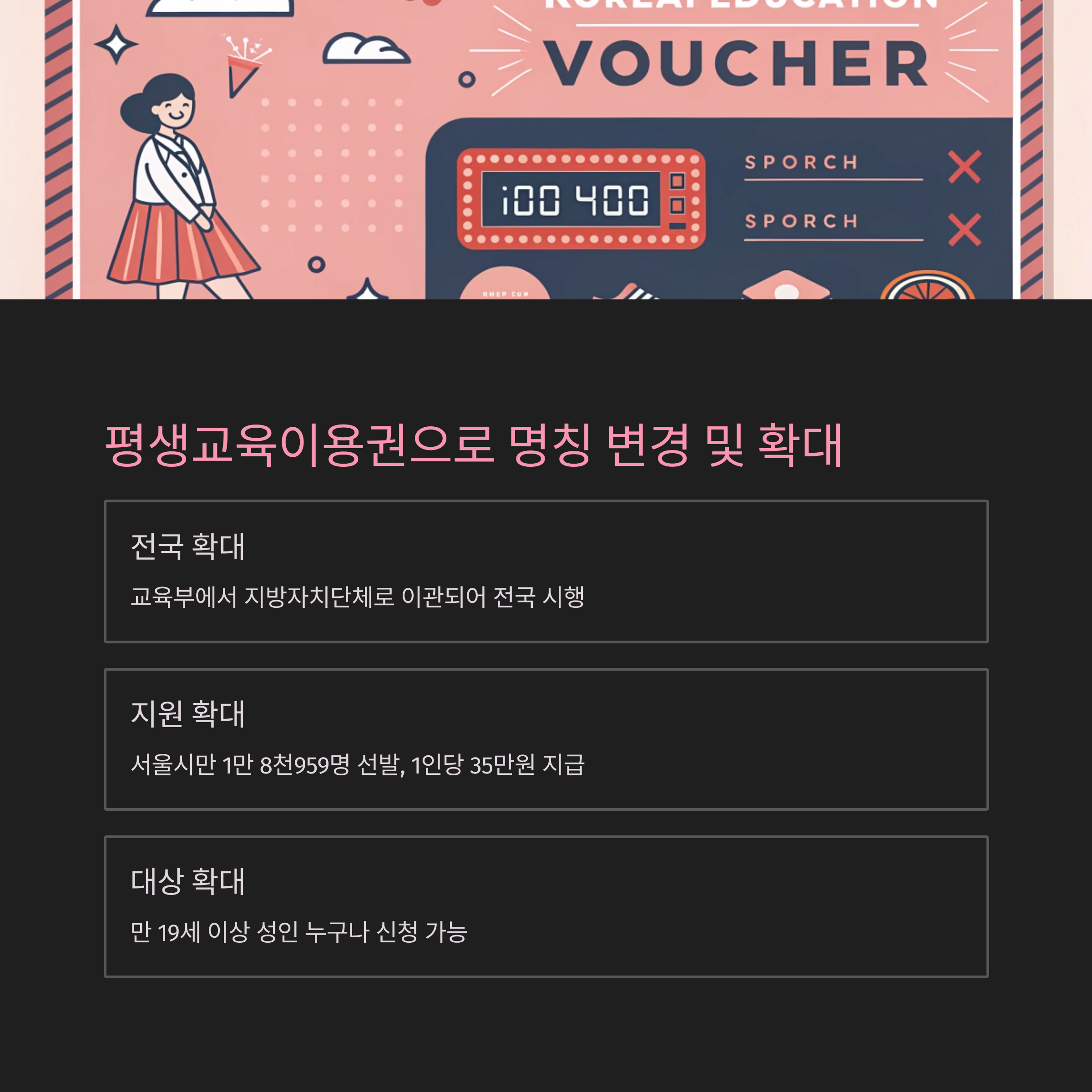 다양한 유형의 평생교육이용권이 신설되어 대상자가 대폭 확대되었습니다.
