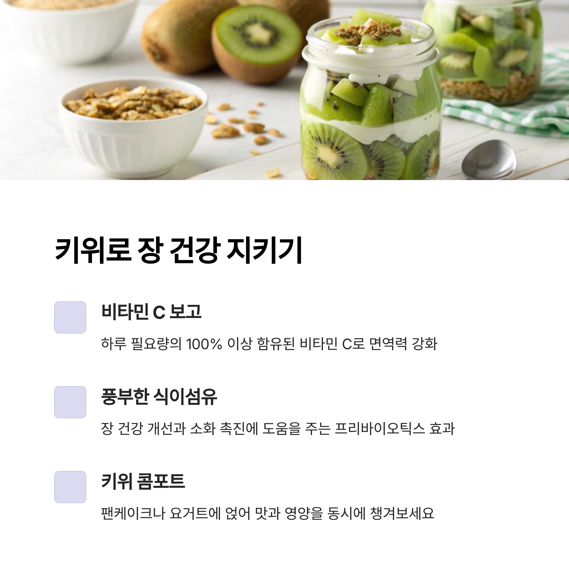 | 항산화 물질이 풍부하고 면역력 강화에 좋음 | 소화 효소인 액티니딘이 포함되어 소화에 도움 | 제철 과일을 활용하면 영양소와 맛을 동시에 챙길 수 있음 |