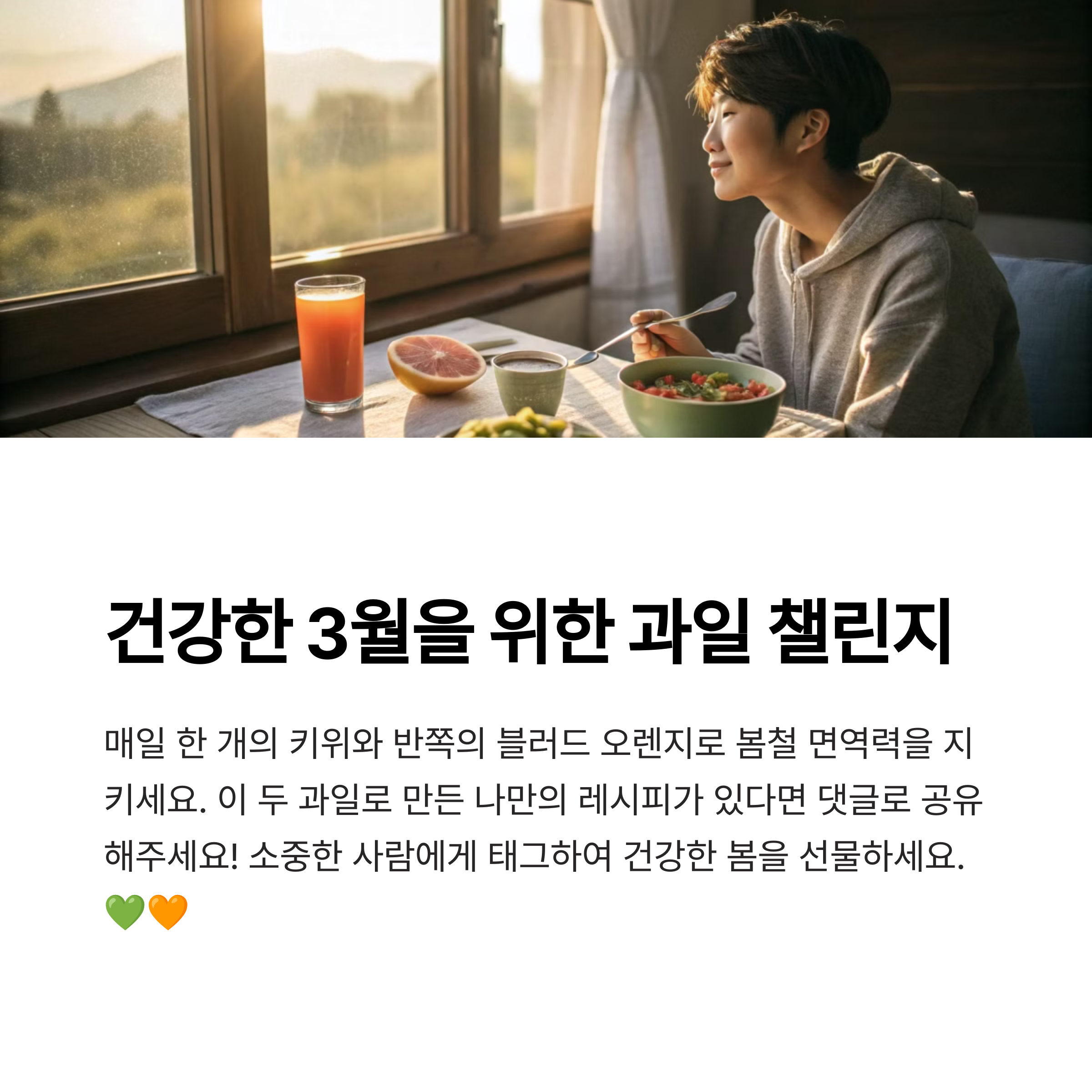 블러드 오렌지와 키위는 3월에 제철을 맞아 건강에 매우 좋은 과일들입니다. 이 과일들을 활용한 다양한 레시피는 맛뿐만 아니라 영양가도 풍부하여, 여러분의 건강한 라이프스타일을 지원합니다. 제철 과일을 활용해 맛있고 건강한 식사를 즐기며, 건강을 지키는 한 걸음을 내딛어 보세요.