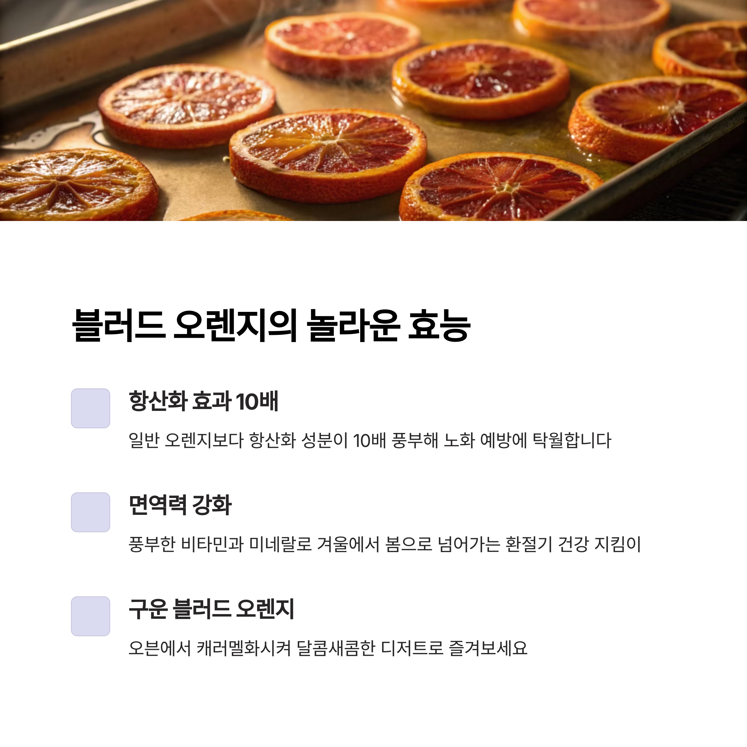 | 블러드 오렌지 | 항산화 물질과 비타민 C가 풍부하여 면역력 향상 |