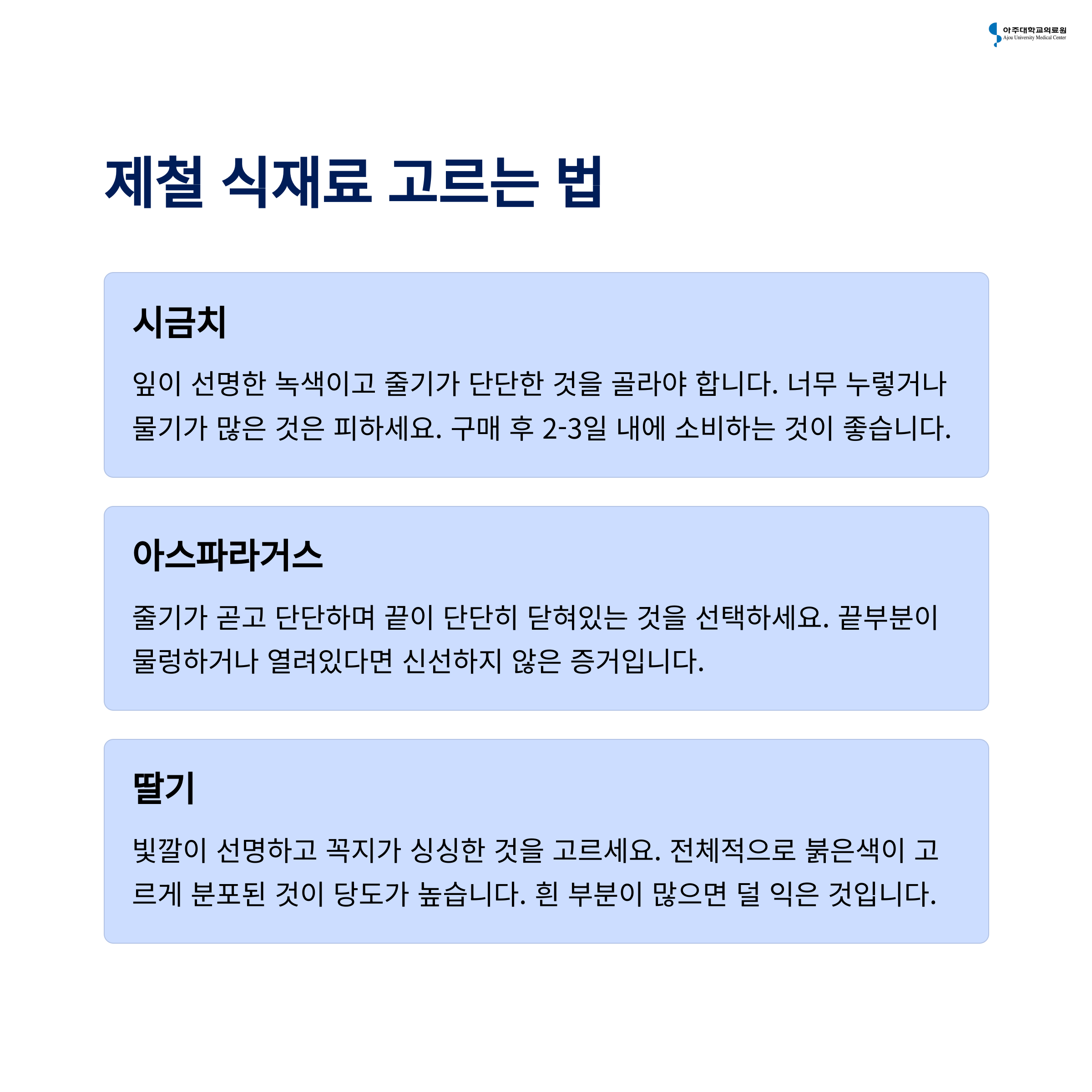 시금치는 잎이 선명한 녹색이고 시들지 않은 것을 고르세요. 아스파라거스는 줄기가 단단하고 끝이 촘촘한 것이 신선합니다.
