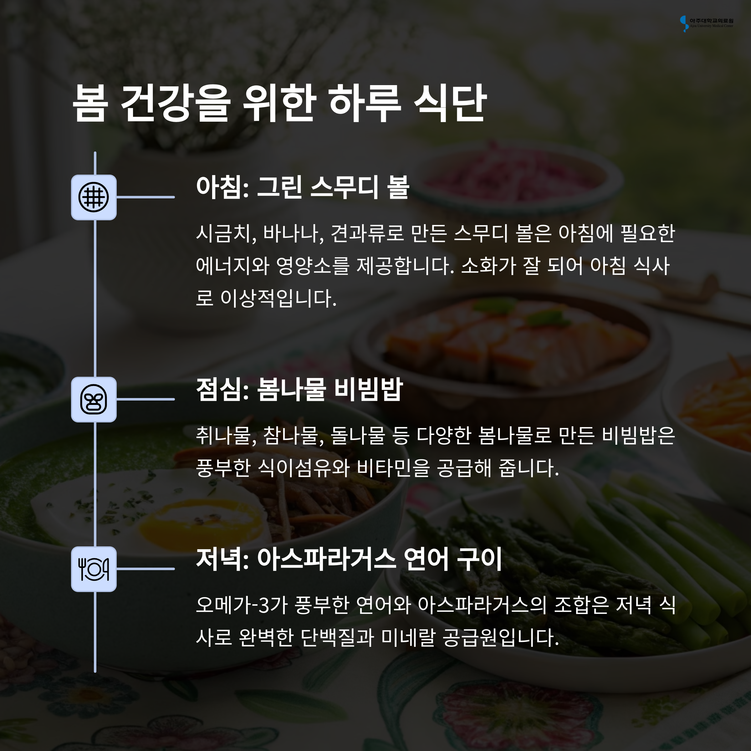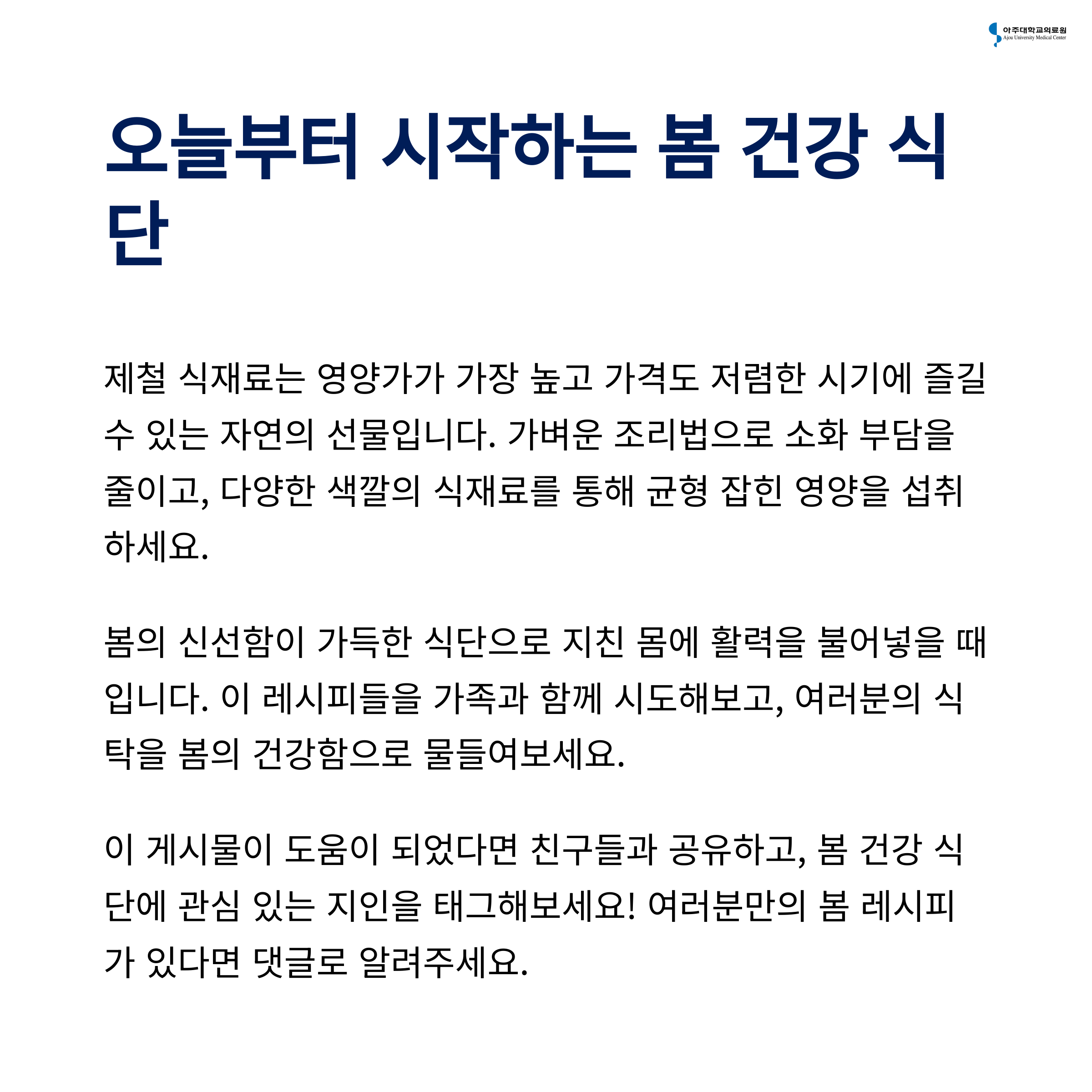 오늘부터 여러분의 식탁에 봄의 신선함을 더해보세요. 몸이 먼저 반응하는 건강한 변화를 경험하실 수 있을 거예요!