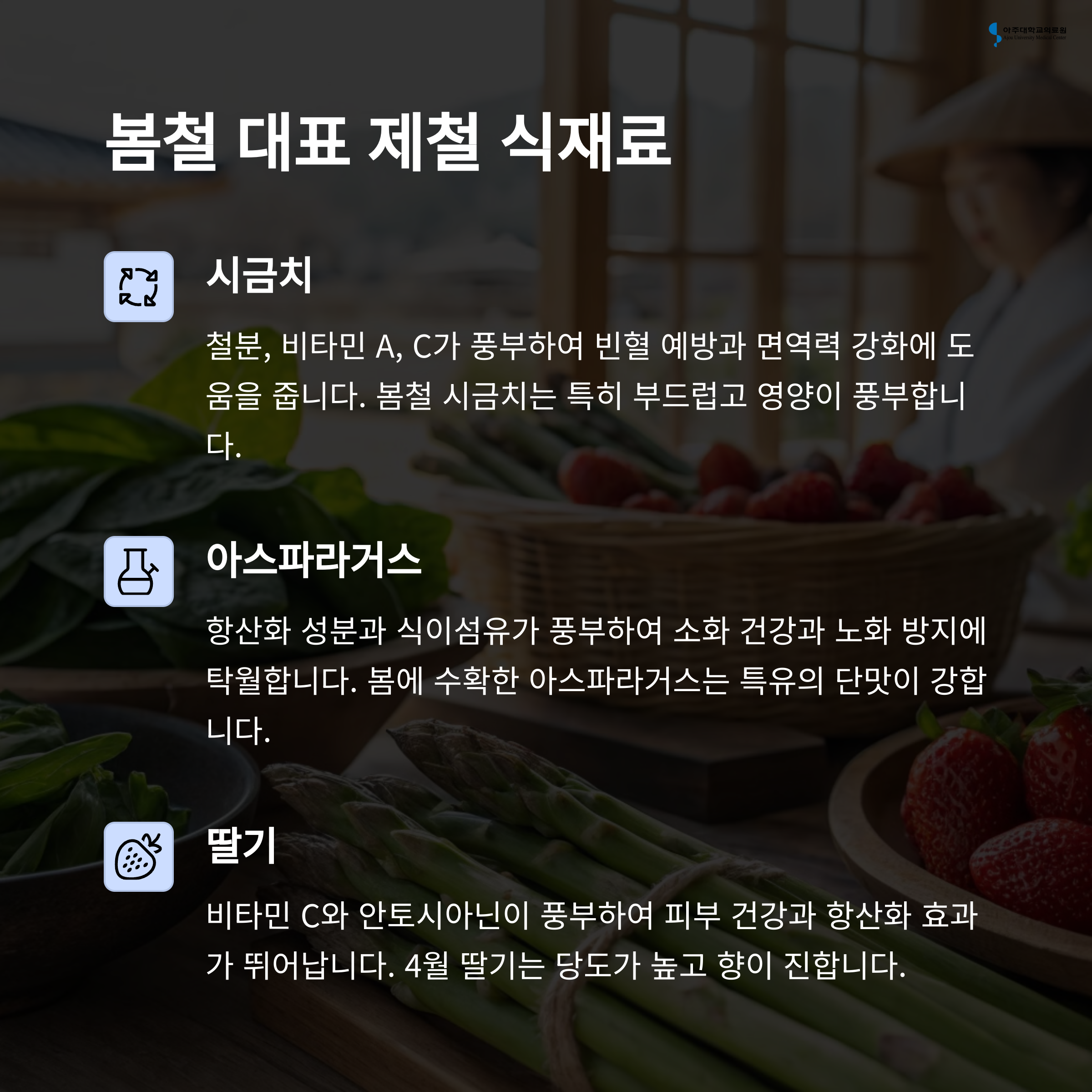 시금치, 아스파라거스, 딸기 등 봄철 식재료는 단순히 맛있는 것을 넘어 우리 몸이 필요로 하는 영양소를 가득 담고 있습니다.
