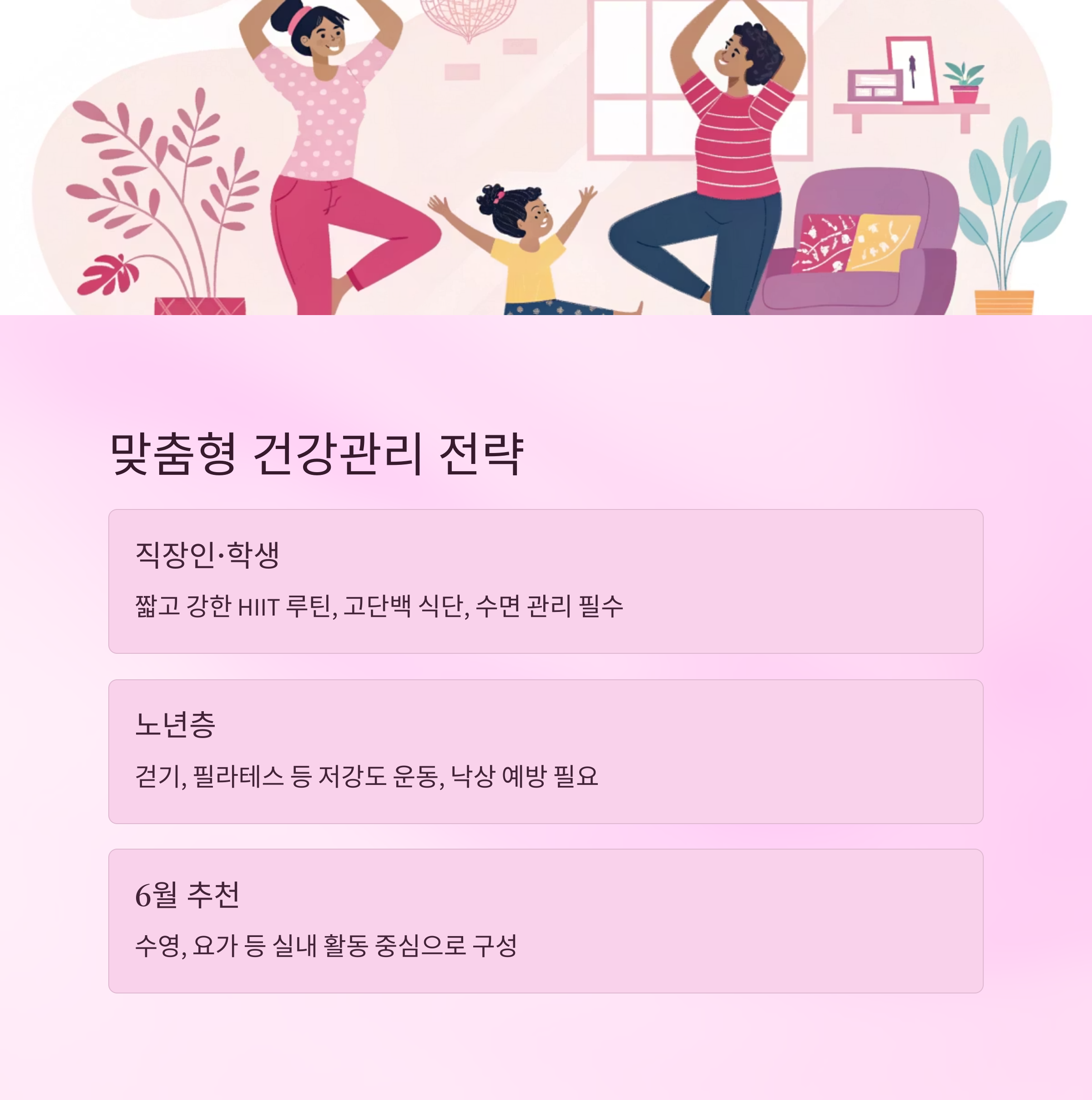 | 노년층 | 걷기+스트레칭 | 낙상 예방 필요 |