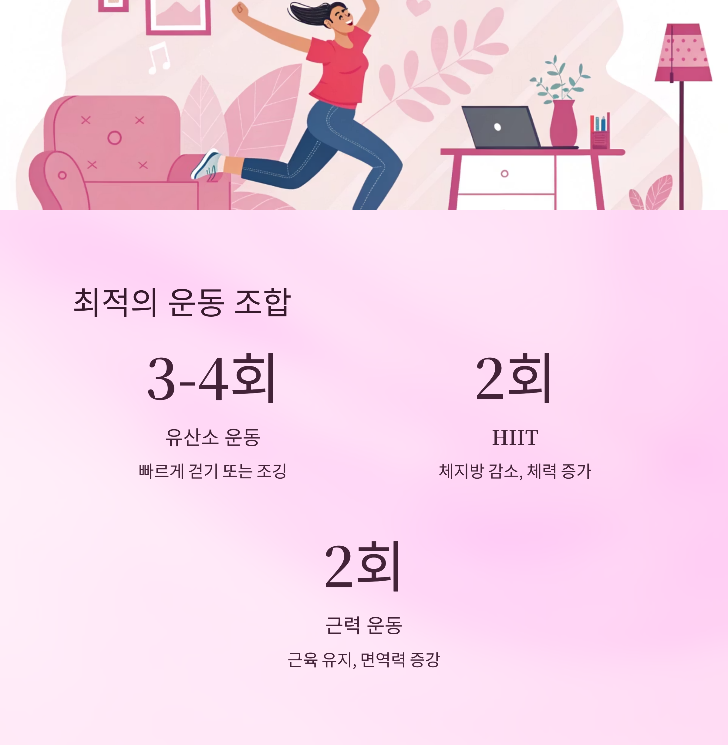 | 근력운동 | 주 2회 | 근육 유지, 면역력 증강 |