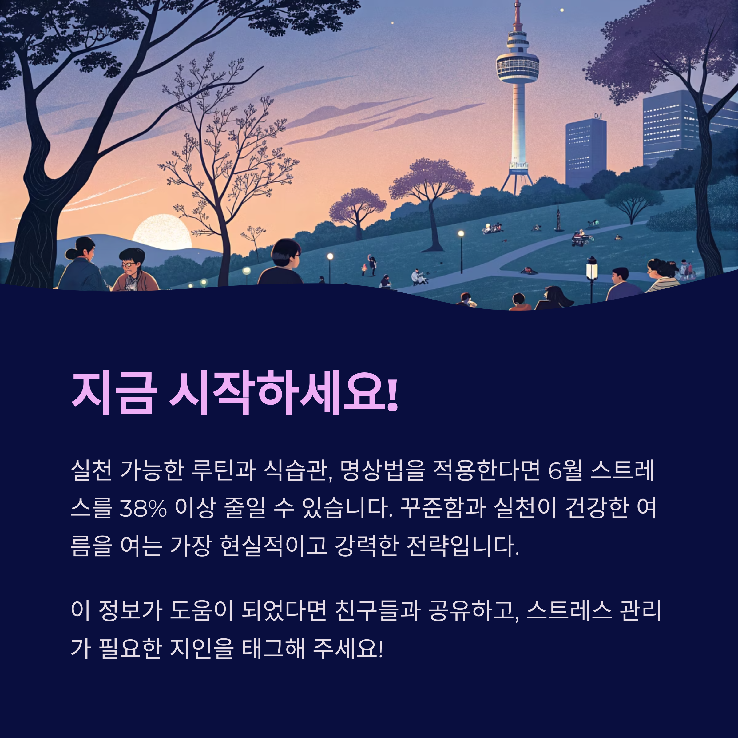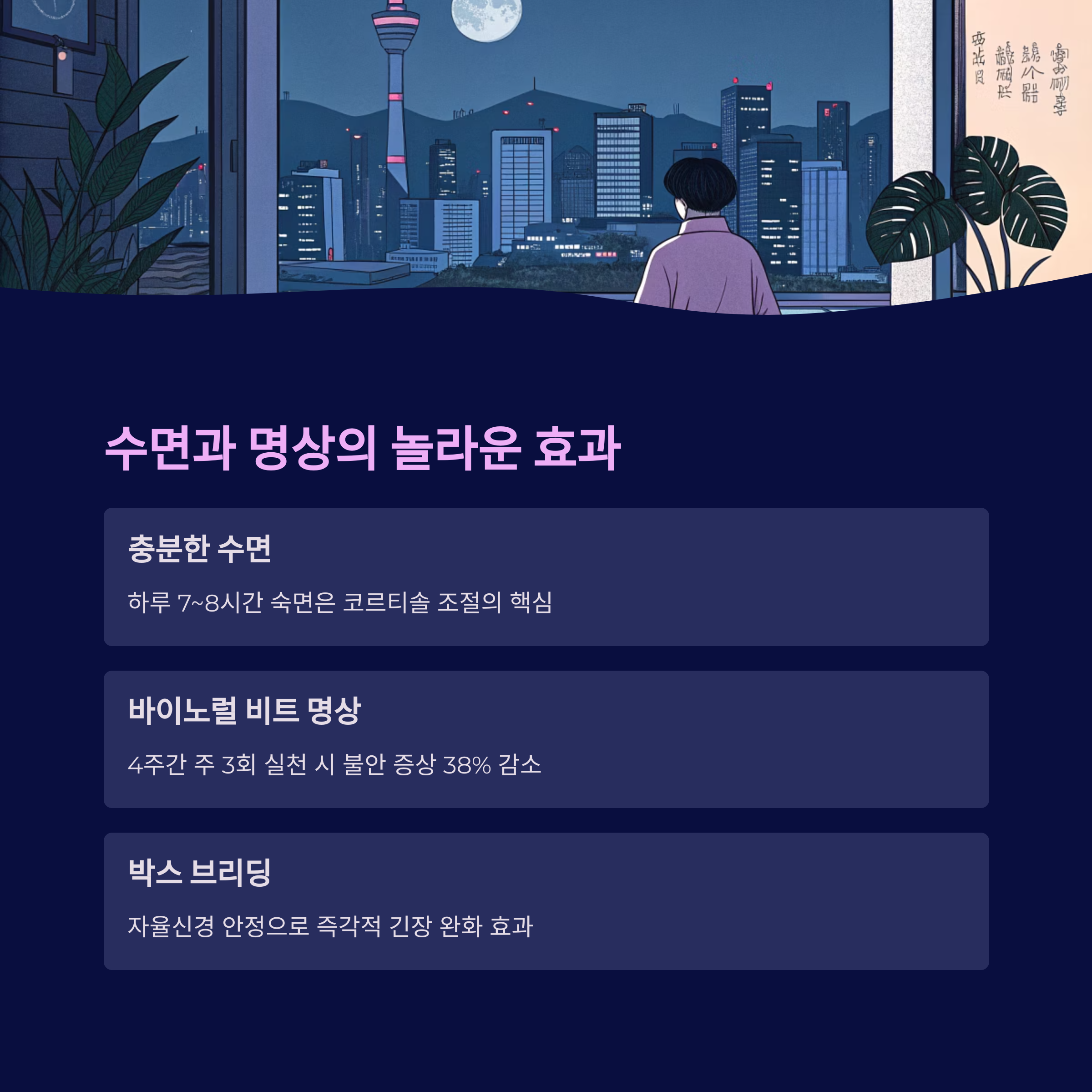 하루 7~8시간 숙면은 코르티솔 조절의 핵심입니다.