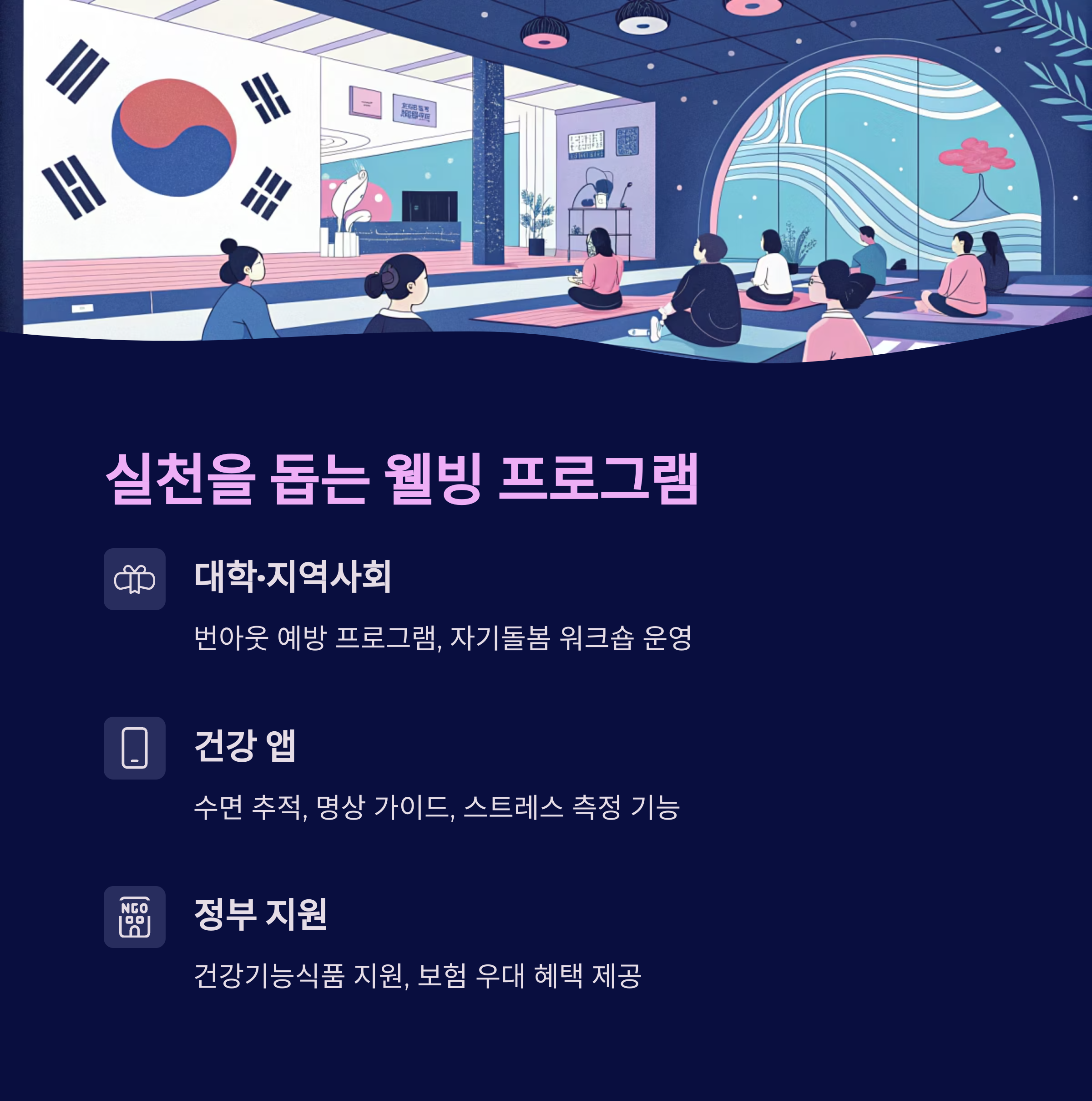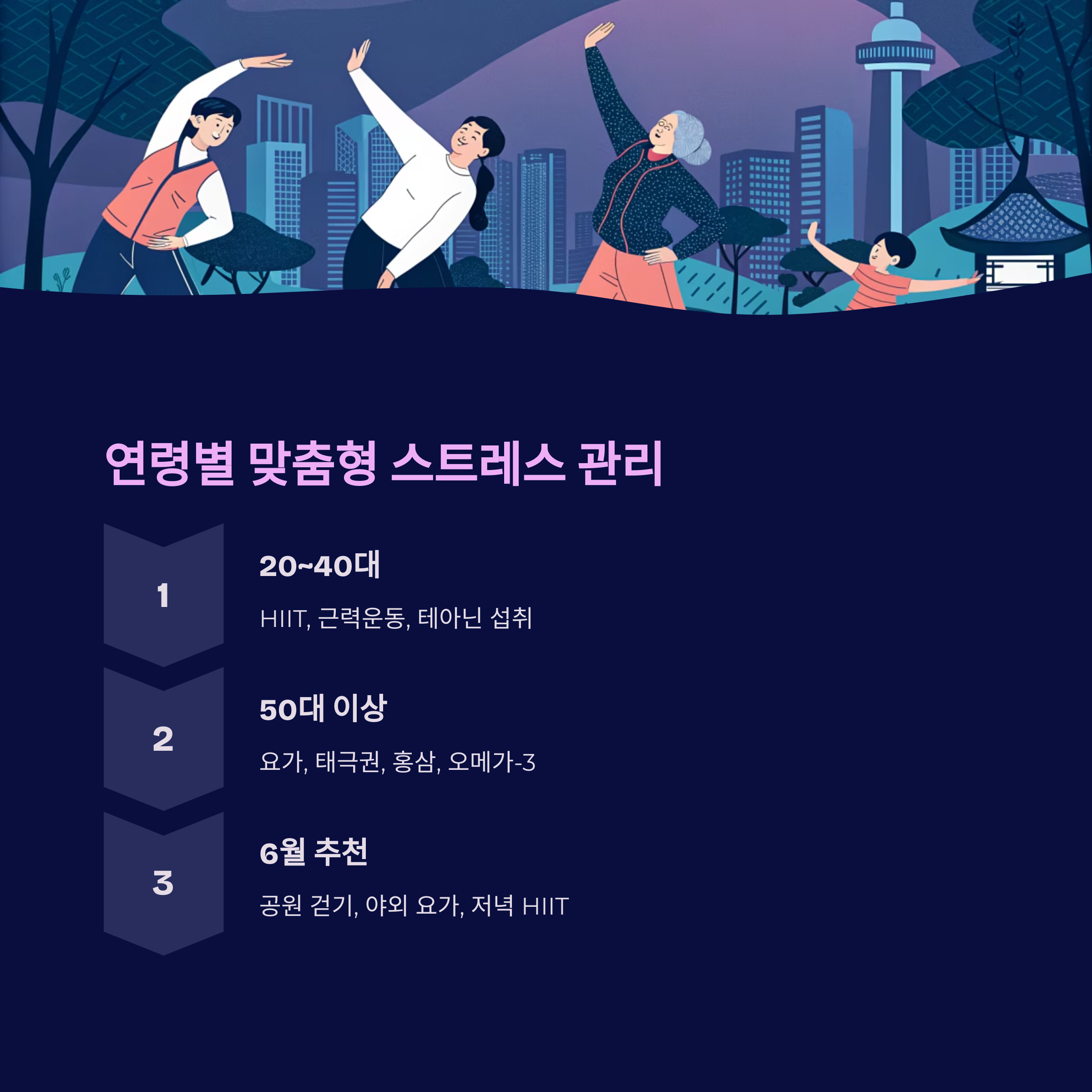 - 50대 이상: 요가, 태극권, 혈관 건강 식품(홍삼, 오메가-3)