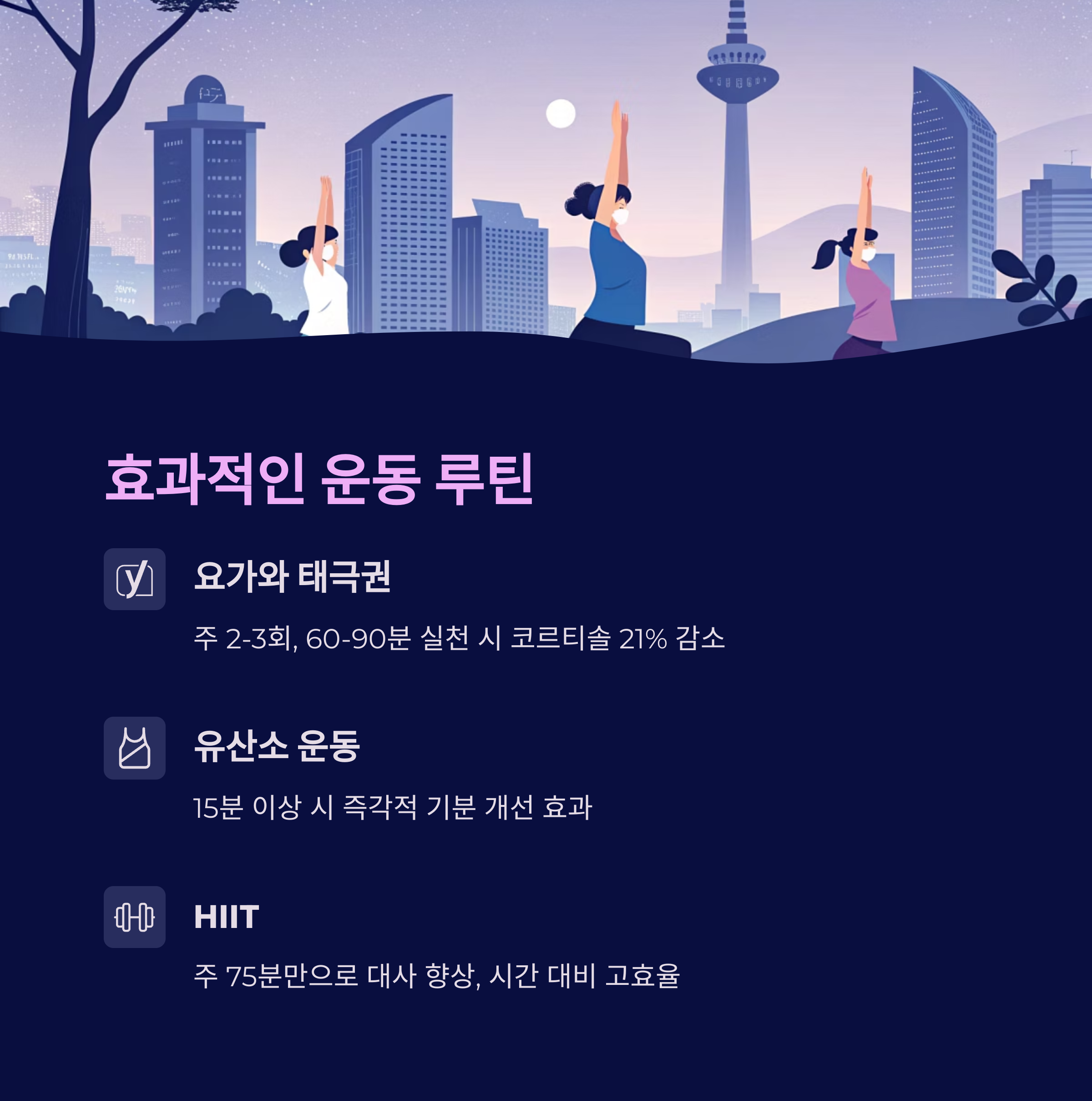 공원 걷기, 야외 요가, 저녁 HIIT 실천이 이상적입니다.