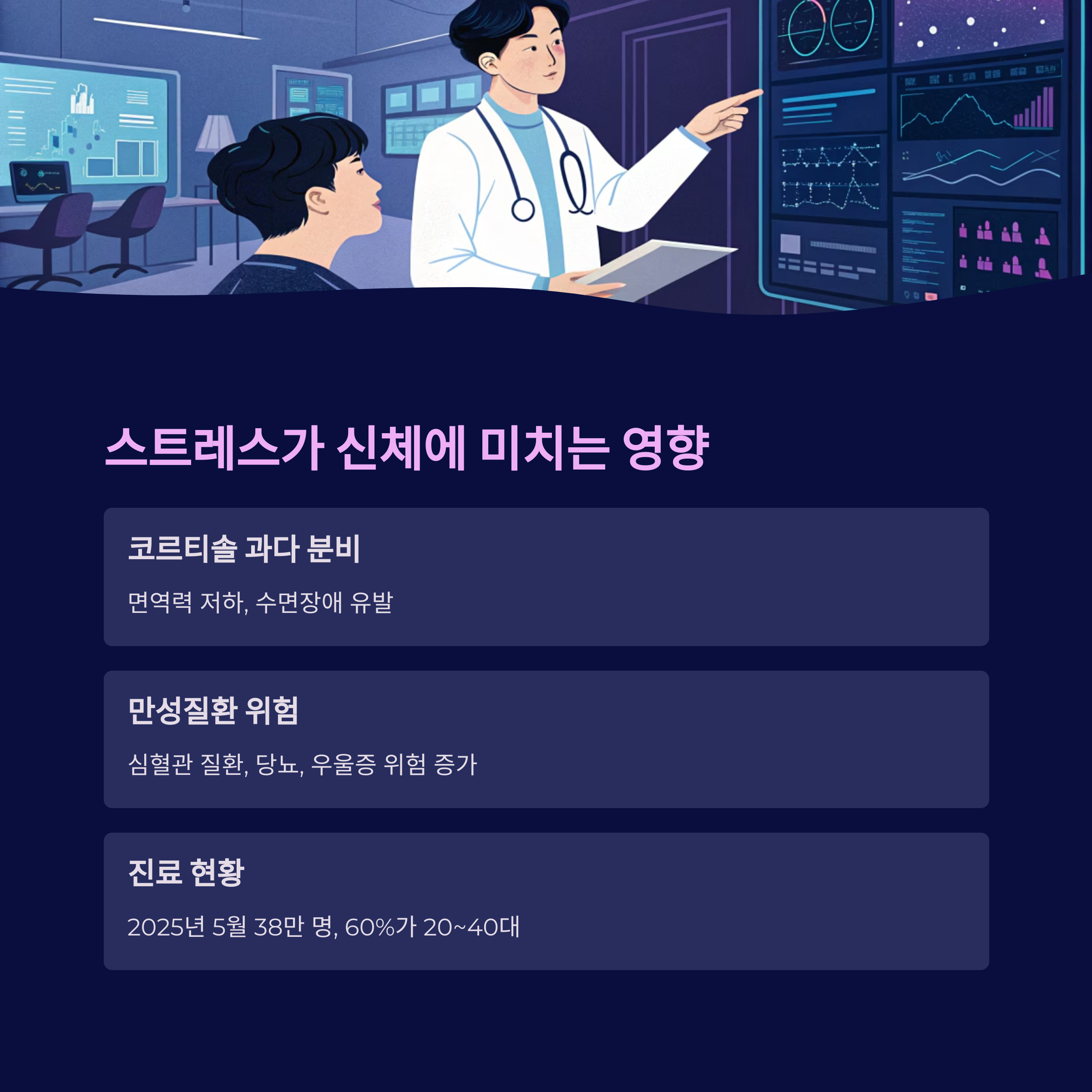 "지속적 스트레스는 심혈관 질환, 당뇨, 우울증의 핵심 위험 요인으로 작용합니다."