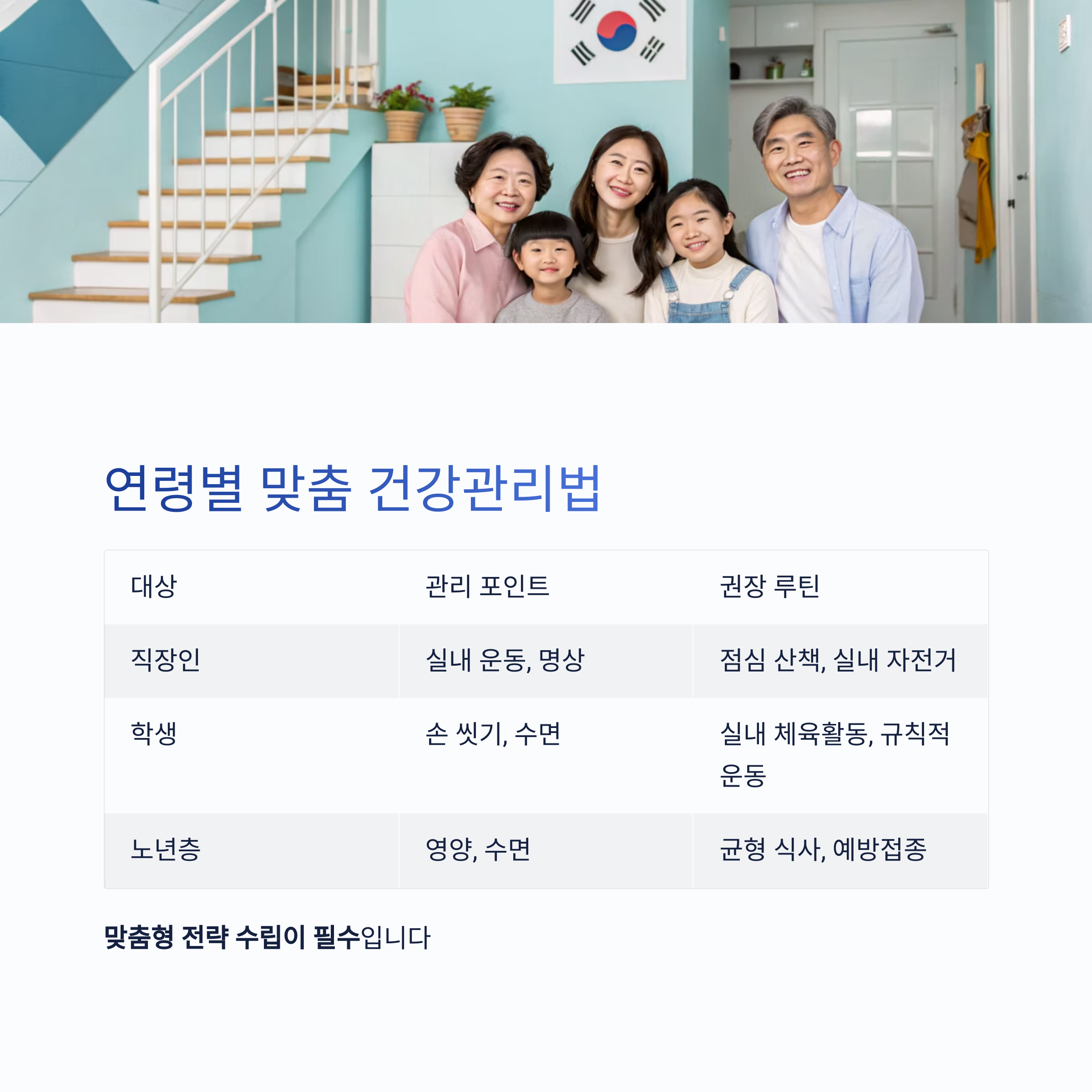 | 노년층 | 영양, 수면 | 균형 식사, 예방접종 |