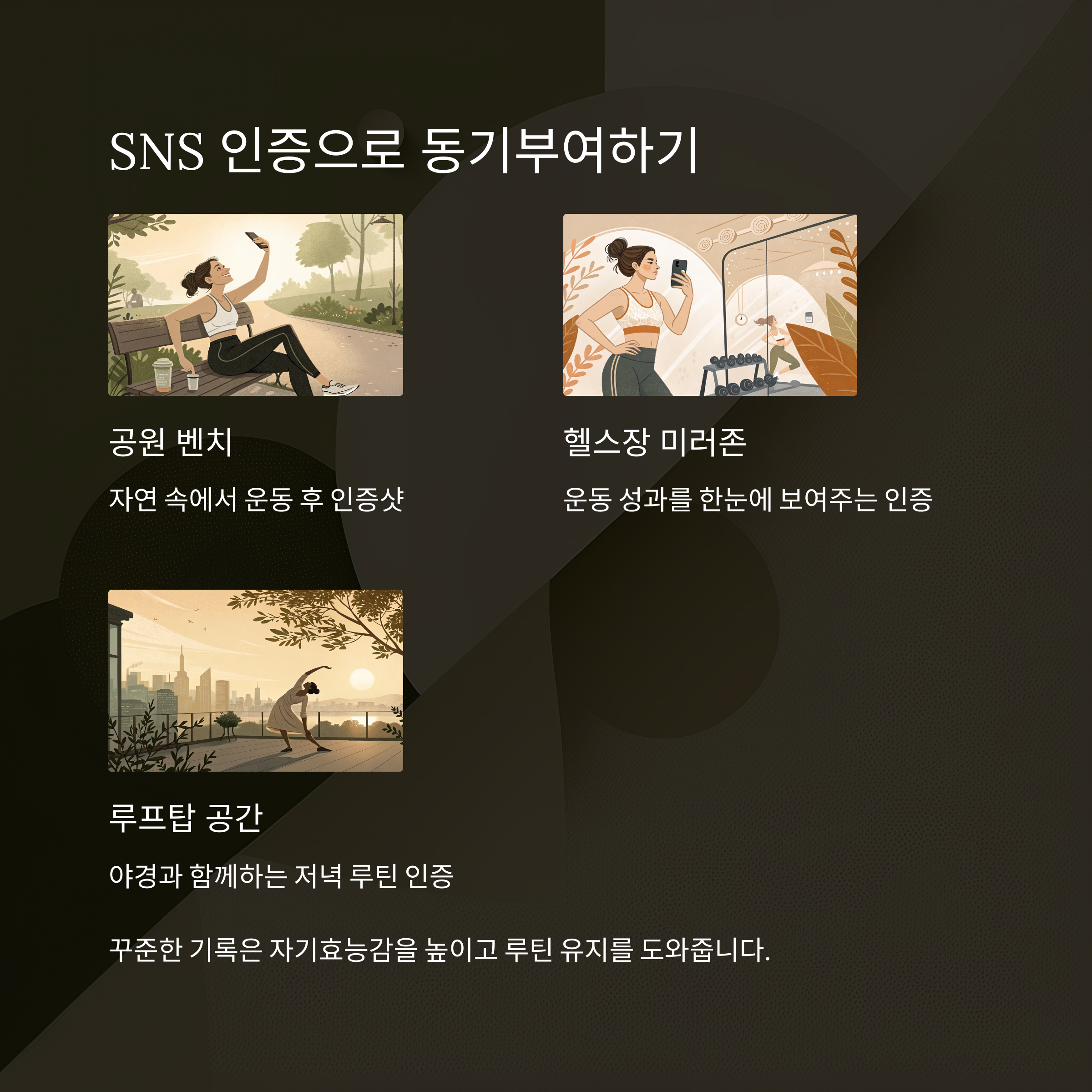 운동 루틴을 SNS에 공유하면 성취감과 꾸준함이 배가됩니다.