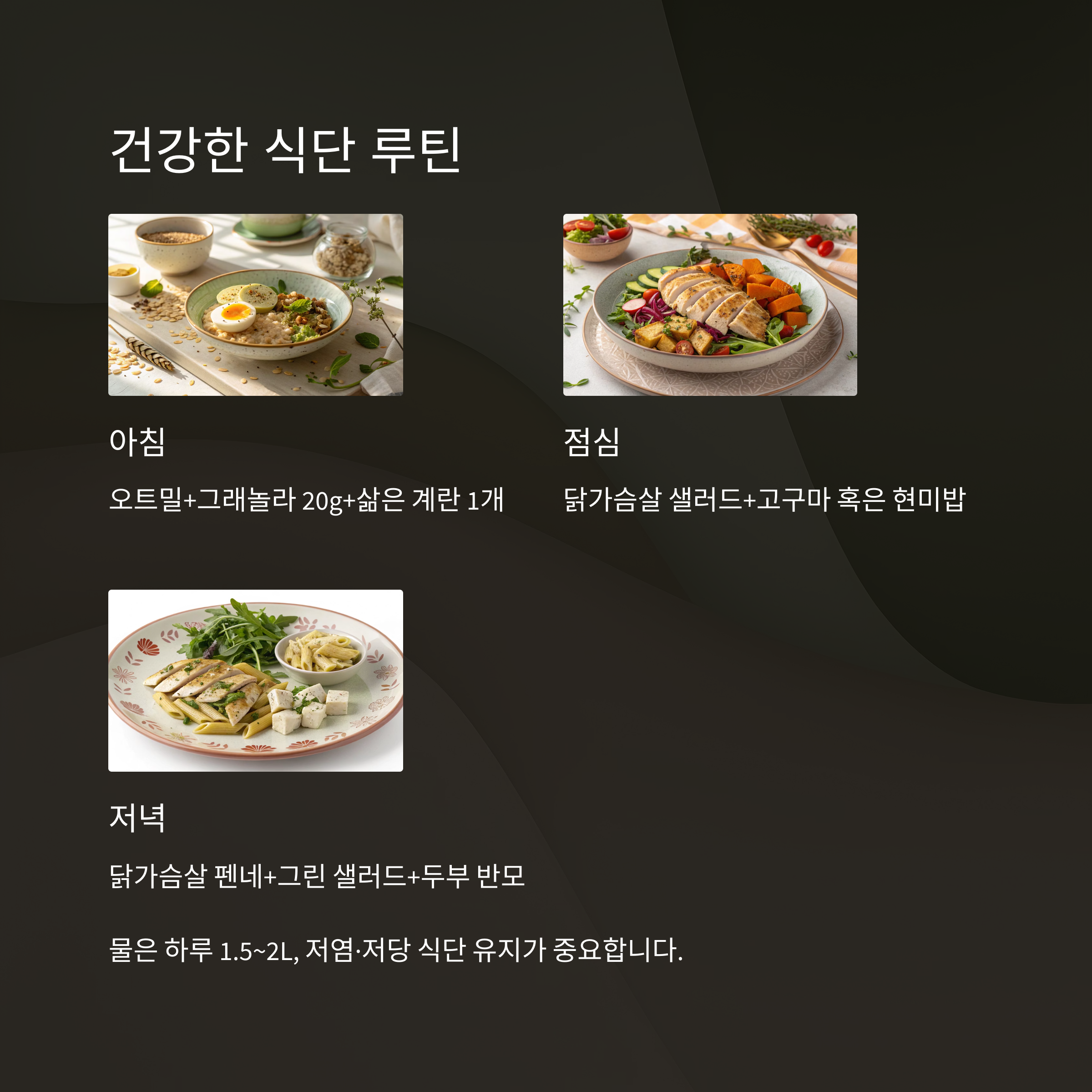 물은 하루 1.5~2L, 저염·저당 식단 유지가 중요합니다.