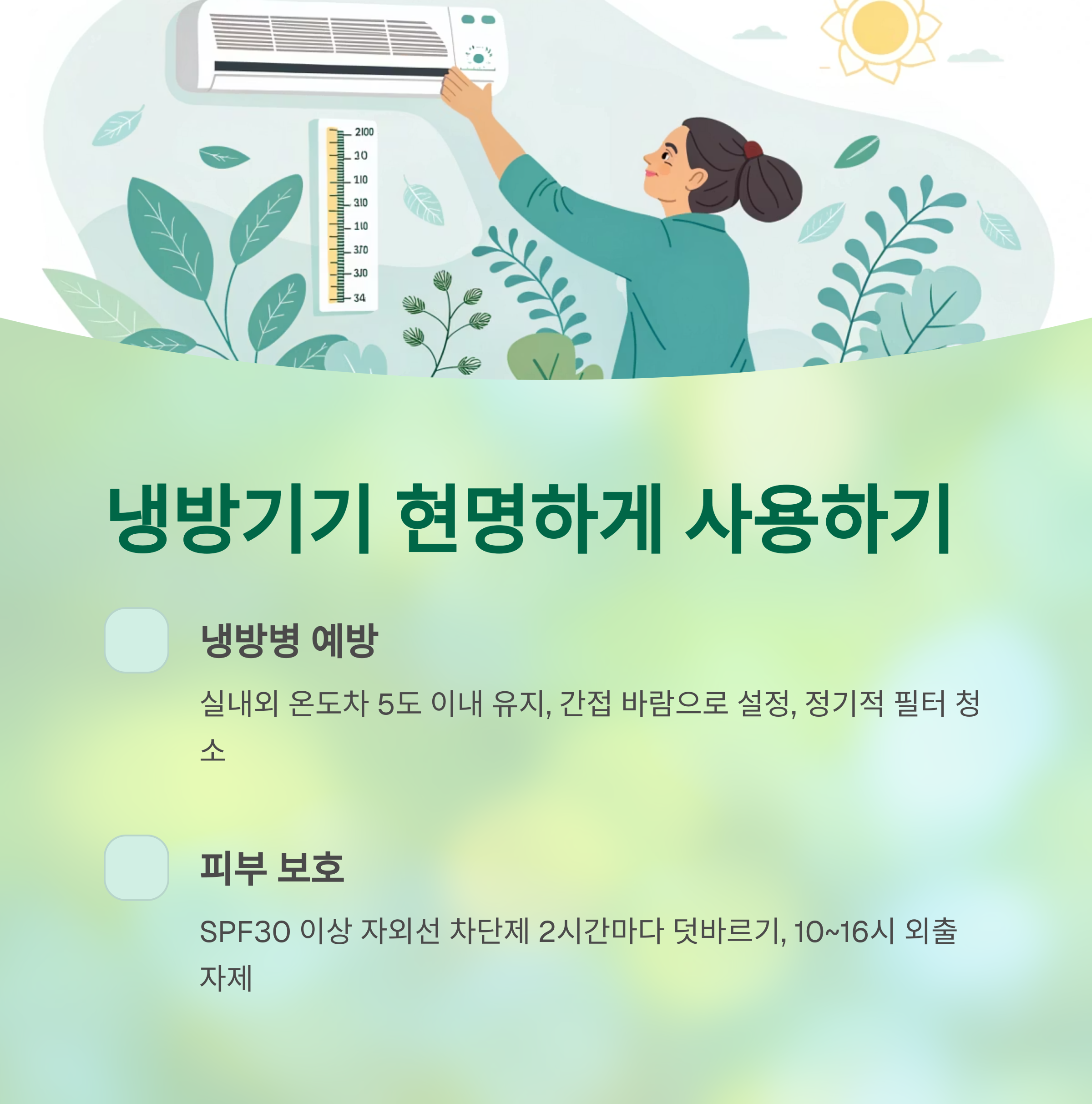 장시간 냉방기기 사용과 습기 노출을 줄이고,