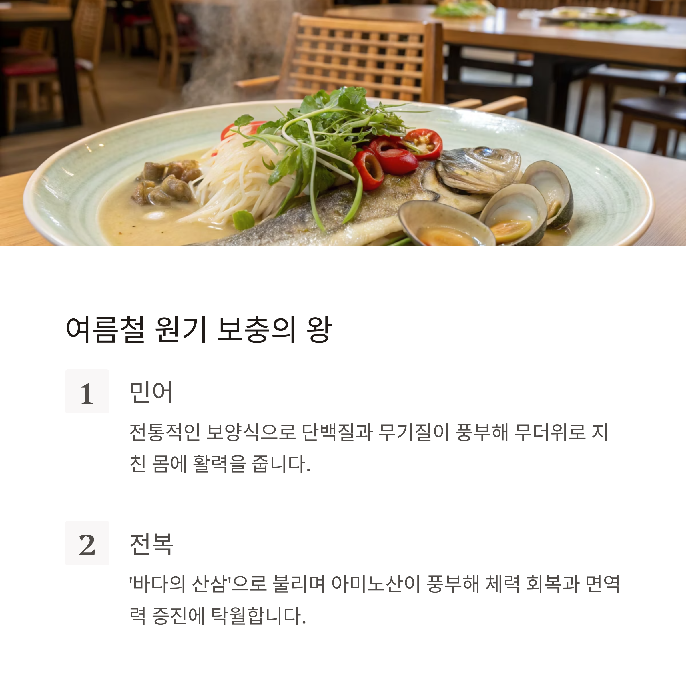 특히 아미노산이 풍부해 여름철 체력 회복과 면역력 증진에 탁월합니다.