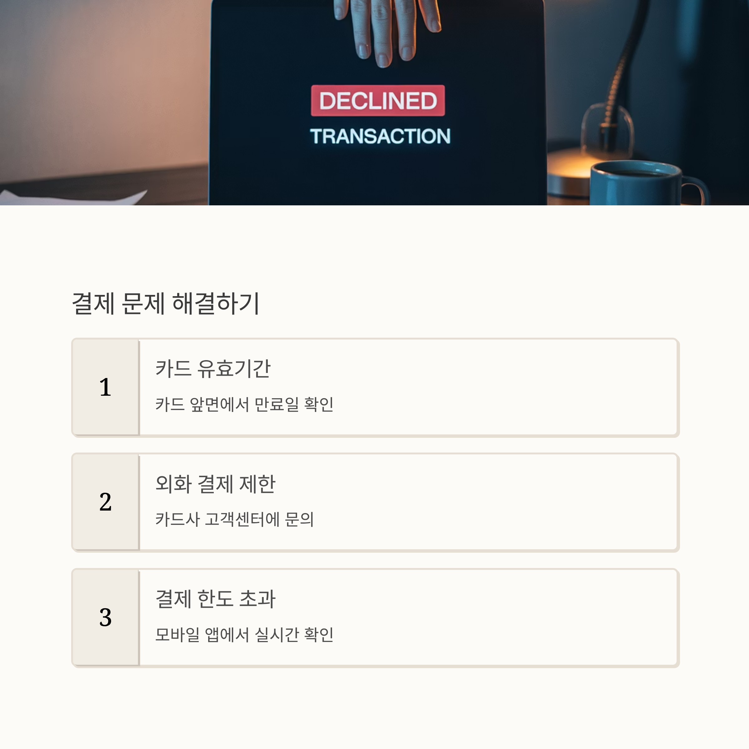 가장 먼저 카드 유효기간과 한도초과 여부를 점검해보세요.