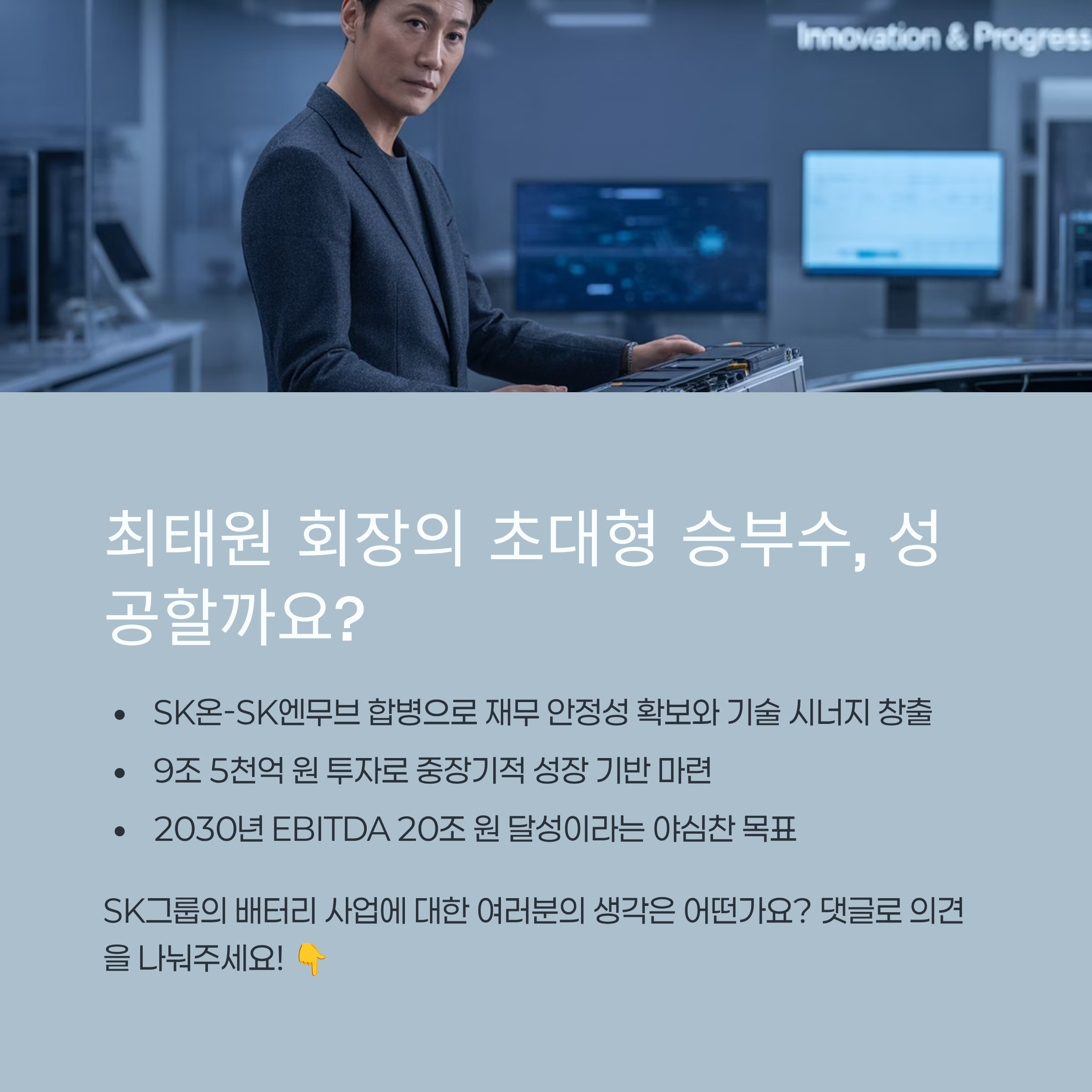 - 초대형 구조개편: SK온과 SK엔무브의 합병을 통해 재무 안정성을 확보하고, 기술 시너지를 창출합니다.