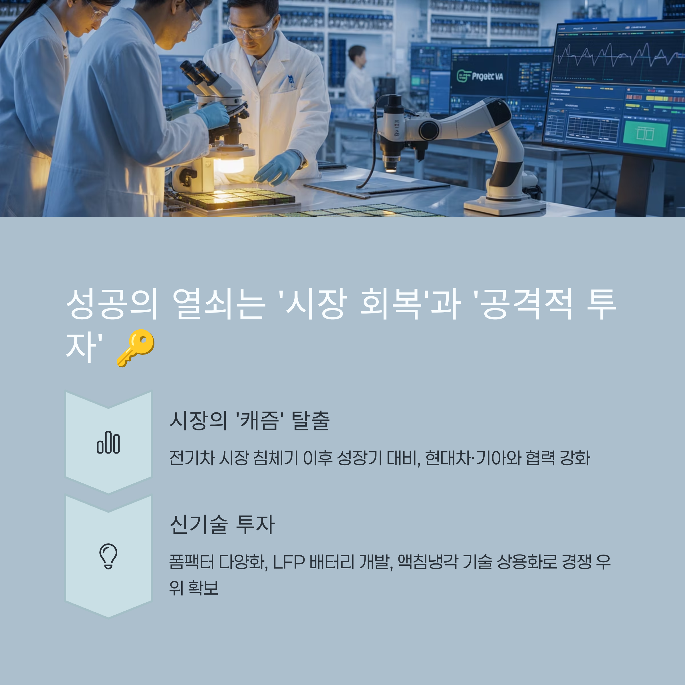 - 미래 성장 동력 확보: 전기차 시장의 침체기를 기회 삼아, 공격적인 투자와 신기술 개발로 2030년 EBITDA 20조 원 달성이라는 야심찬 목표를 세웠습니다.